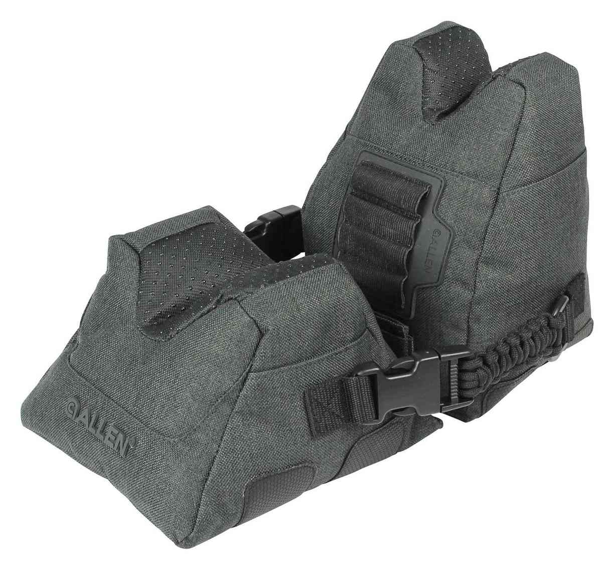 The Eliminator Front / Rear Range Bag Combo makes sight-in easier. The Gun Cradle fabric found in the valleys of the front and rear rest has just the right amount of resistance. The gun can easily be moved to acquire the target yet stays steady on the semi-tacky surface. The two components are connected for carrying utilizing straps with side-release buckles. One strap is made up of a paracord handle to improve the grip and carrying experience. The front rest has an integrated 4-round rifle cartridge carrier made from elastic and thermoplastic.