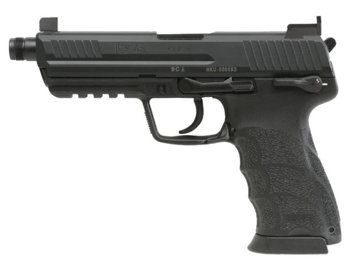 Heckler & Koch, MFG# 81001117, UPC: 642230269385, UOM: EA, HK45T Tactical V1, .45 ACP, 5.2″ Threaded Barrel, Night Sights, Black, (2) 10-rd , HKUS, HKUSHG10, HKUSHGALL, HG10, HGALL