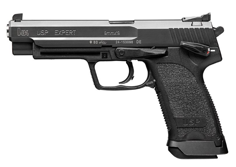 Heckler & Koch, MFG# 81000363, UPC: 642230261556, UOM: Each, USP9 Expert, 9mm, 5.2″ Barrel, Adjustable Sights, Black, V1 DA/SA, (2) 18-rd, Jet Funnel, HKUS, HKUSHG10, HKUSHGALL, HG10, HGALL
