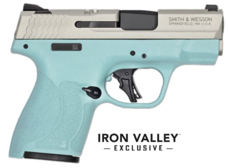 Smith & Wesson, MFG# 14297, UPC: 022188899085, UOM: EA, M&P Shield Plus, 9mm, 3.1″ Barrel, White Dot, Thumb Safety, Stainless, Robin Egg Blue, (2) 10-rd, IVS Exclusive, Compliant , SMIT, SMITHG10, SMITHGALL, HG10, HGALL